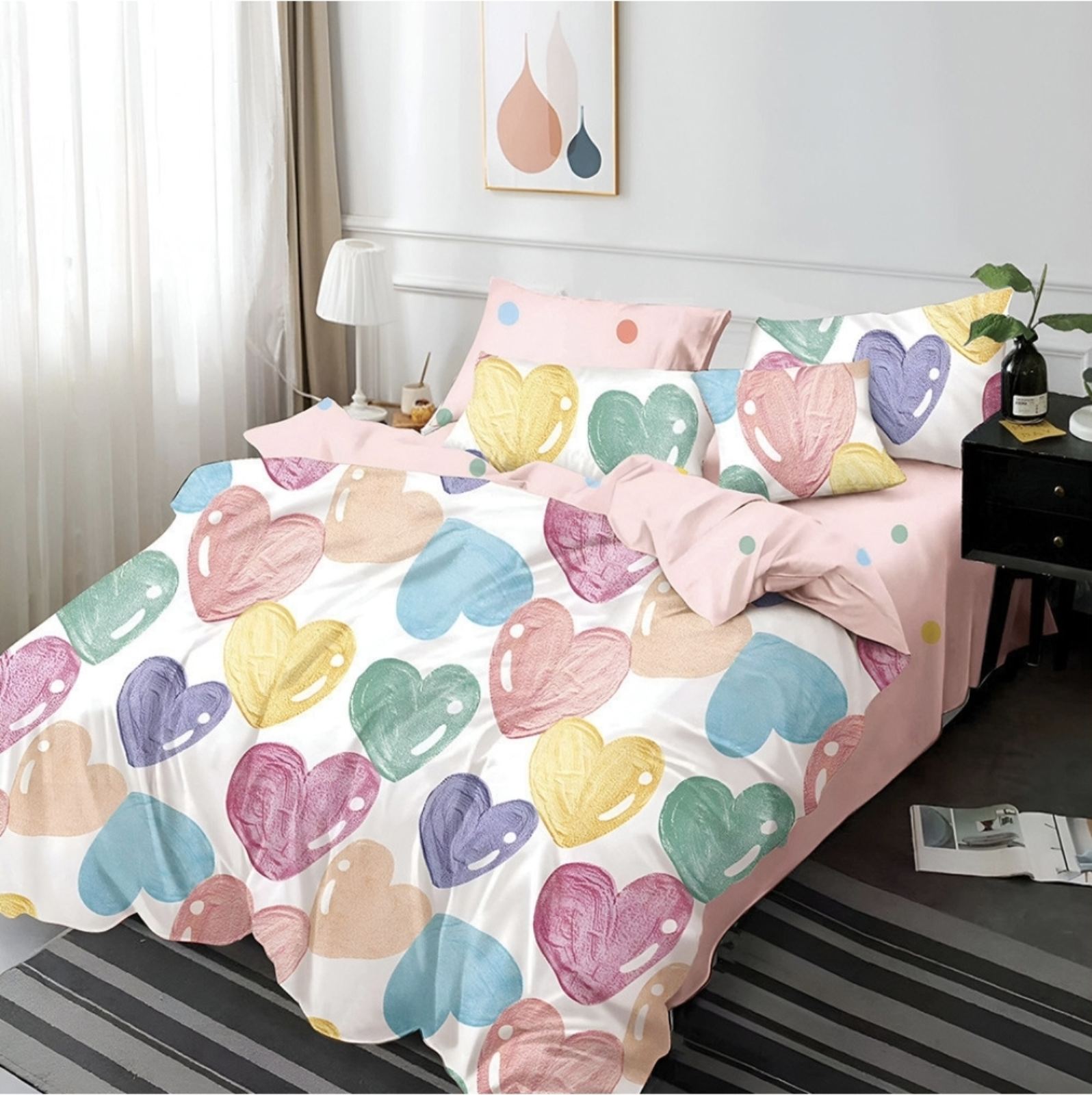 Спален комплект ЦВЕТНИ СЪРЦА съчетава комфорт, качество и романтична визия. Изработен от висококачествена смес от 90% памук и 10% сатен, комплектът осигурява мекота и лек сатенен блясък за повече уют и естетика. Двулицевият горен плик позволява разнообразие във визията на леглото, а цветните сърца носят настроение и свежест във всяка спалня.